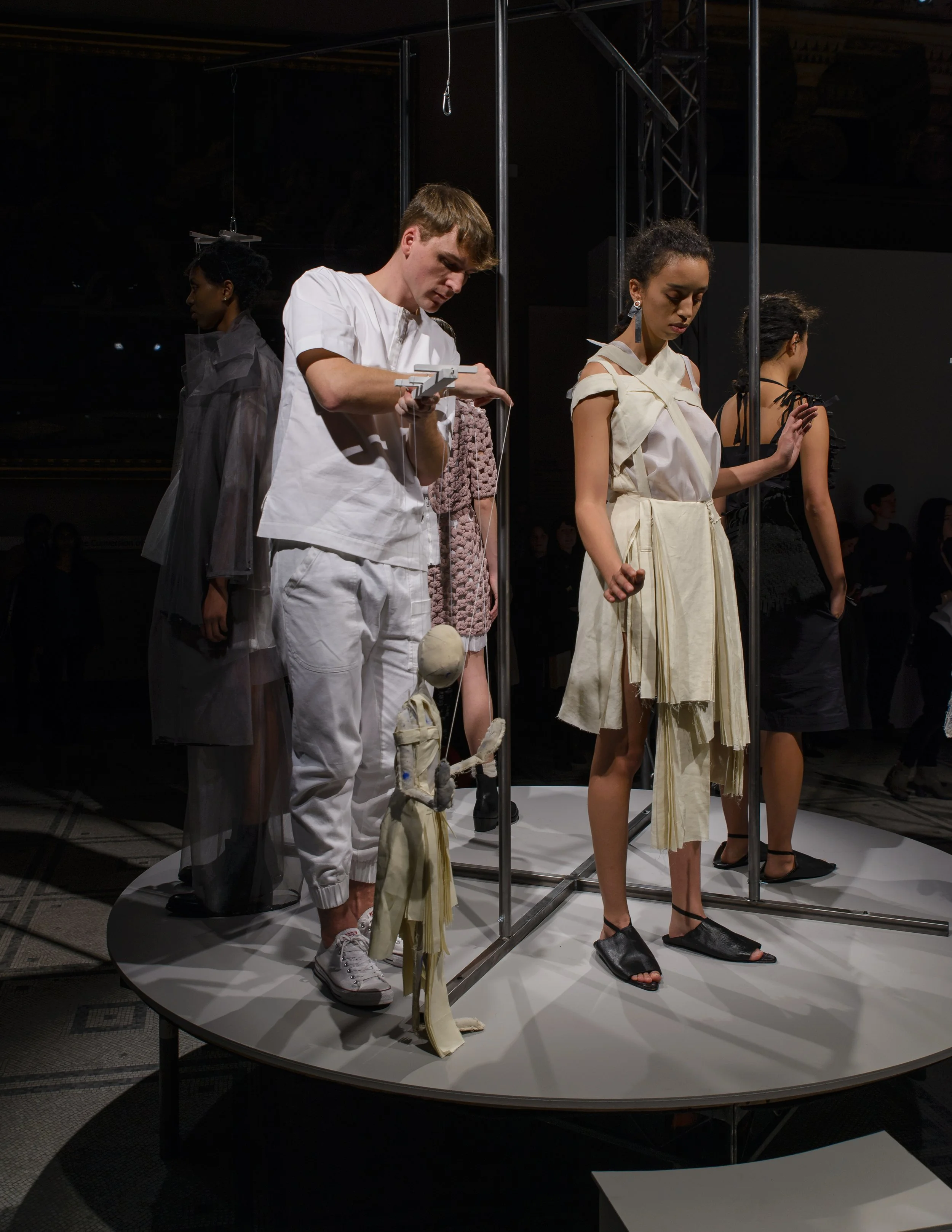 After its debut at London Fashion Week, the piece was shown again as part of the V&A fashion in motion exhibition. For this we crafted marionette versions of each piece to sit alongside their human counterparts.