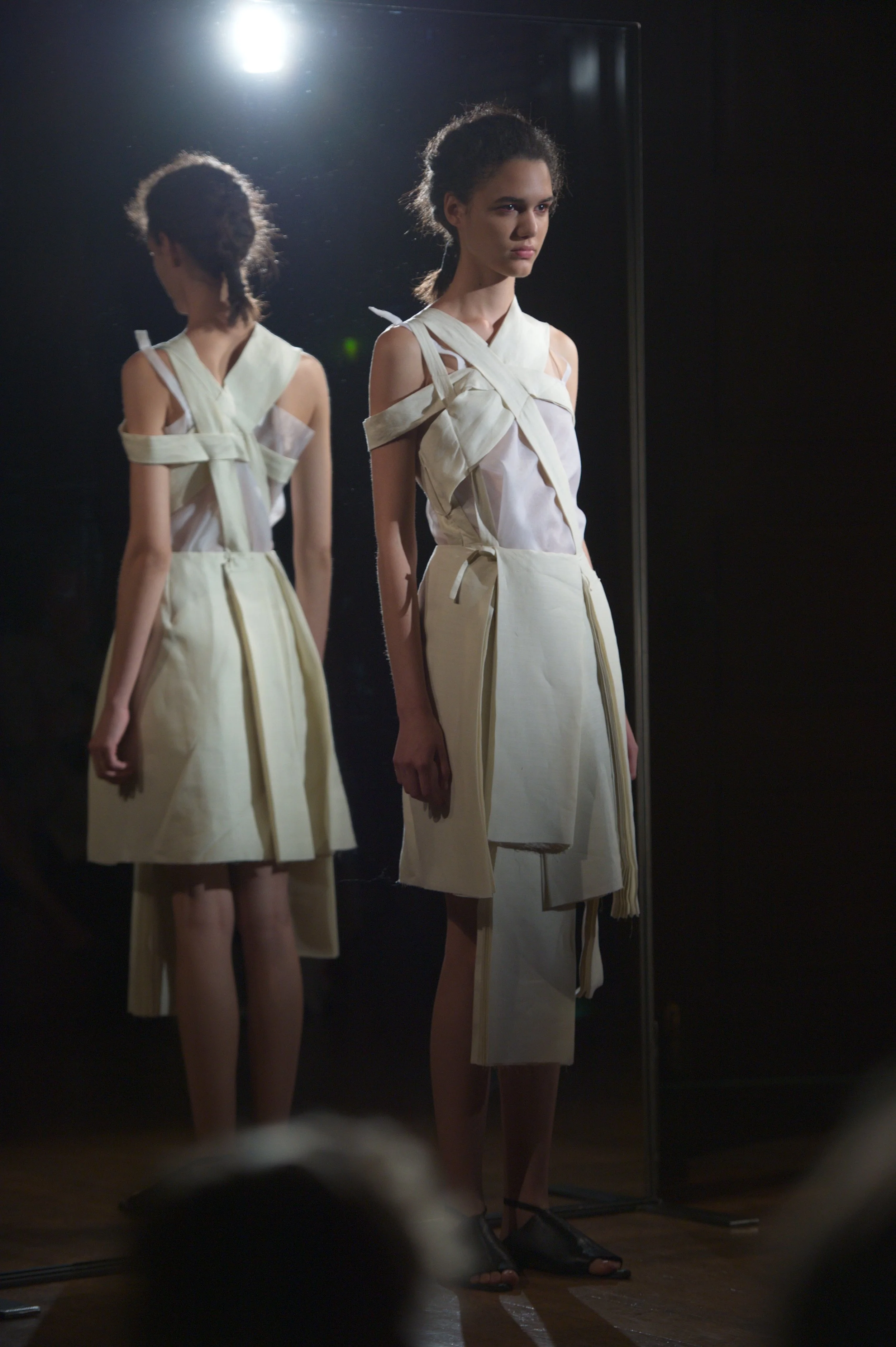The wide strap star, criss-crosses across the top of the body, which then suspends and falls into bunches of pleated linen. Each element of the garment is engineered to carefully interweave with one another to form an articulated dress.
