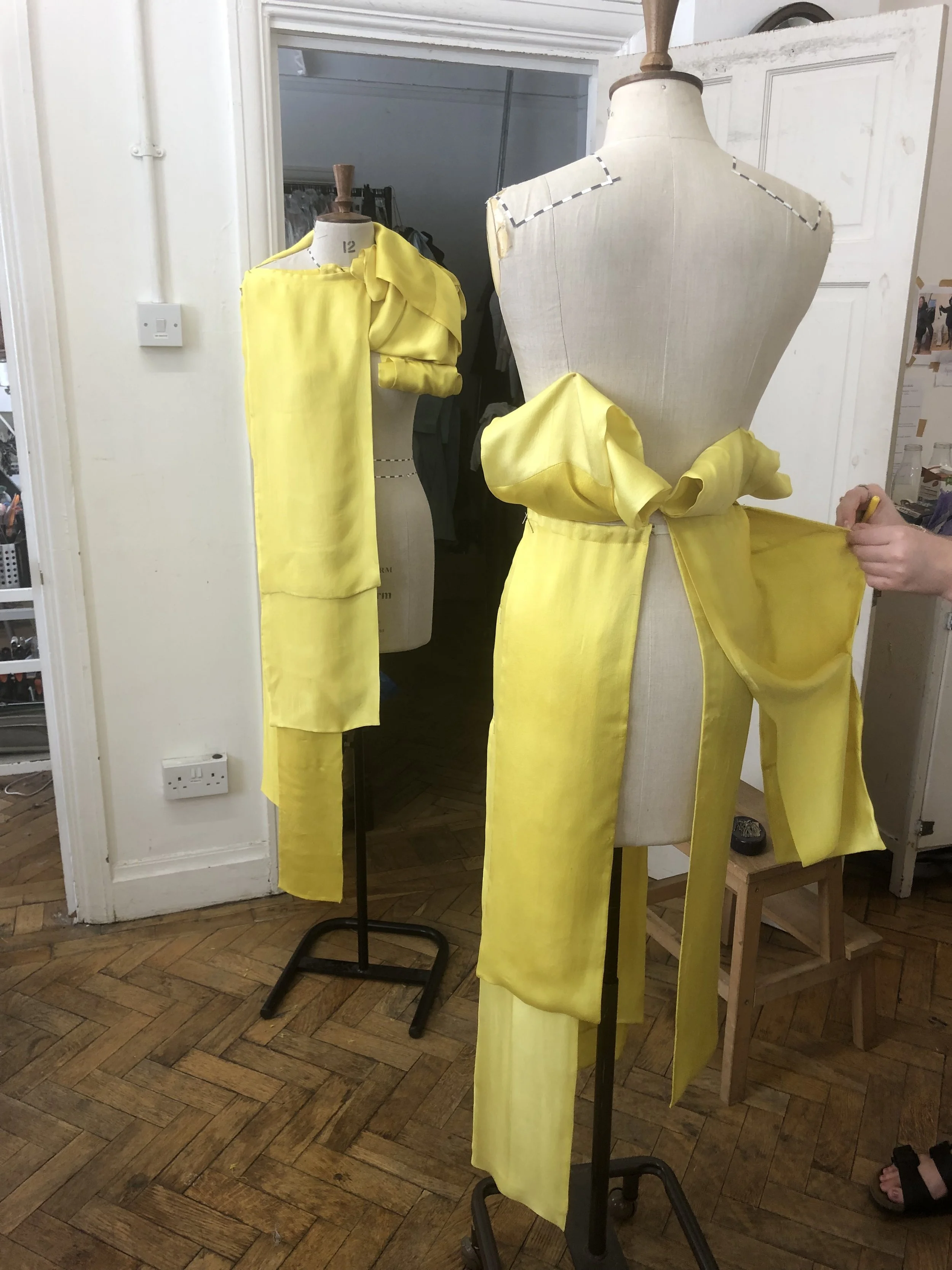 Directly dying the sewn silk strips allowed the Weld dye maximum surface area to affect the fabrics colour. When combined with the silk protein fibre base it resulted in a very, very bright clear, almost electric yellow – a fitting reflection of the narrative of the collection.